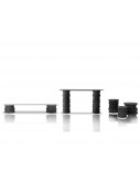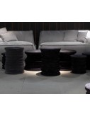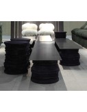 Solid cedar legs, disc-shaped, black-stained aniline. Painted steel T-frame (small table and consolle) or painted steel tubular frame (tables). Table top in black 3 mm sheet, antirust protection with matt clear-coat varnish. The legs may suffer normal cracks, characteristic of solid wood.