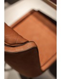One-piece frame with steel insert. Flexible cold-expanded polyurethane foam padding. Unique seat and back cushion in differentiated density polyurethane with acrylic fibre covering. Matte black-varnished metal legs with satin brass, hand finished burnished metal or satin nickeled metal, with matte varnish feet end. Cushions upholstery with a special square quilting. Decorative piping in the same shade of leather.