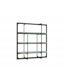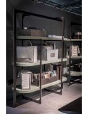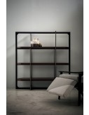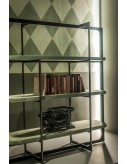 Laser cut frame in satin brass-coated metal, in hand-finished burnished metal or in satin nickeled metal, with matte varnish. Shelves in fir plywood covered with leather. Adjustable feet height.
