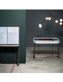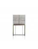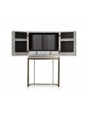 Base in satin brass-coated metal, in hand-finished burnished metal or in satin nickeled metal, with matte varnish. MDF frame with leather upholstery. Interior in India rosewood with matte finishing.