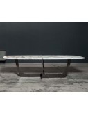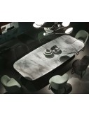 Base in antiqued brassed metal, hand-finished burnished metal or satin-finish metal with matte varnish laser cut 15 mm thickness. Marble or wooden top covered with leather with decorative inserts following the finishing and the positioning of the base. Marble top versions: glossy Gold Calacatta, glossy White Gioia Marble, glossy Bardiglio Grey.