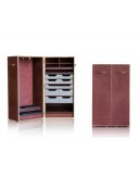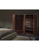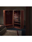 Frame in birch strips with leather covering. Satin brass piping and hinges. Leather-covered compartmentalized inner structure and clothes stand with India rosewood veneered drawers and shoe rank. Base with wheels.