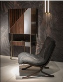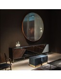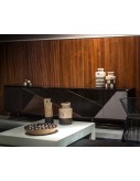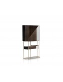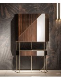 The structure is carried in veneered mdf in black-stained walnut. The front is carried out through a play of essences, materials, finishes, marquetries. Essences: walnut, ebony, solid walnut, retro-lacquered crystal, satin brass. The finish is carried out by hand. Satin brass-coated metal leg, completely bolted. Regarding the bar cabinet, the inner parts are covered with mirror. Pieces created by hand; each item will therefore be dižerent and unique.