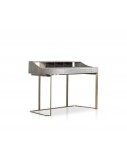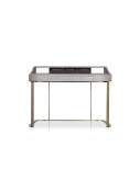 Base in satin brass-coated metal, in hand-finished burnished metal or in satin nickeled metal, with matte varnish. MDF frame with leather upholstery. Little drawers in India rosewood with matte finishing and decorative structure in metal.