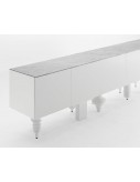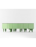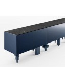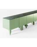 Containers, doors and shelves in MDF with different widths. Legs in turned solid alder wood. Monochrome lacquered finishes available in green RAL 6021, white RAL 9016 or blue RAL 5011. Back and internal parts are lacquered in a matt finish. Doors, laterals and legs are lacquered in a gloss finish. Marble cabinet tops are Verde Patrizia, Carrara Venato or Nero Marquina.