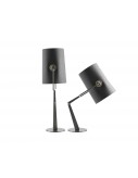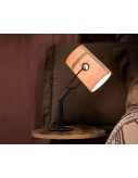 Table lamp with diffused and direct light. The outline of the matt satin finish polycarbonate diffuser is covered with pure linen fabric, with a purposely uneven weft and warp of the fabric achieved by hand. The fabric is stained and undergoes anti-fray treatment; it is then cut into pieces and tailored by hand using a sewing machine with visible seams. The brass eyelets are galvanised in gun barrel colour. A special locking and sliding system positions the diffuser along the rod; a hand-welded painted steel fork houses the linear halogen light bulb, allowing the diffuser to turn freely through 360° along its axis. The rod and base are made of powder-coated steel, while the joints on the rod are painted black for the ivory version and brown for the brown version. These joints make it possible to bend the rod in two places, at the base and in the middle, allowing users to shape the lamp to their liking. Silk-screen printed matt Diesel logo at the base of the rod, the electrical cable and dimmer are transparent.