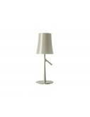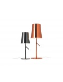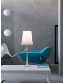 Table lamp with diffused light. Die cast zinc alloy base and steel rod, both liquid coated. Opaline injection-moulded polycarbonate internal diffuser, translucent injection-moulded polycarbonate external diffuser. In the large version and in the small version with touch dimmer, the sensor is located on the tip of the rod arm and allows the gradual adjustment of the luminous intensity; electronic transformer on the transparent cable. In the small version without dimmer, the ON/OFF switch is located on the transparent cable. small table.