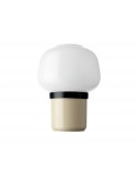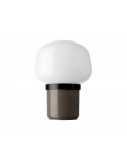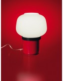 Table lamp with diffused light. Hand-blown cased opaline glass diffuser with glossy finish. Base comprising a double cup: one made of black polycarbonate and the other in batchdyed ABS, achieved through injection moulding. ON/OFF switch on the transparent cable. With personalized packaging.