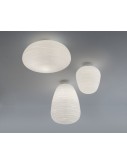 Collection of ceiling lamps with diffused light. Three diffuser shapes of hand-blown glass made using a glass-blowing procedure without turning the glass in the mould (referred to as "stationary"). The striped effect is achieved using a mould with negative decorations which are repeated across the surface of the glass, which is subsequently ground manually "by belt" and which then undergoes immersion in acid in order to emphasize the plaster-like effect. Ceiling fitting in epoxy powder coated metal.
