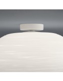 Rituals is a combination of east and west, memory and modernity, poetic inspiration and technological research. It is a family of distinct, complementary shapes that translate the luminous magic of oriental rice paper lanterns into the precious physical form of blown glass. The special glass working method, with irregular lines that mark the surface, was created by the industrialisation of the artisan process of grinding. The result is a delicate, fascinating decoration that produces a unique sensation of chiaroscuro and a soft and gentle light. The strength of this design concept has allowed us to develop new sizes and uses, which are not merely adaptations, but real explorations of the further possibilities of this project. The ceiling version, available in three different forms and sizes presents the diffuser in its entirety, thanks to a discrete frame, a pure and simple circular shape that leaves the whole focus on the glass.