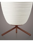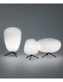 One, two, three lanterns that are lightweight yet brimming with seductive texture. Three different yet concurrently complementary shapes, balancing between the east and the west. A family of lamps that sheds its relaxing light in the most diverse settings, conveying the magic of rice paper or mulberry tree bark, the raw materials of traditional Japanese lanterns, in the precious physical appeal of blown and frosted glass. The horizontal lines which cut across the surface of the lamps give rise to a soft and charming décor and at the same time contribute to filtering the intensity of the light source, diffusing a full, warm and soft light into the room. The blown glass body – with its pleasantly plaster-like appearance – is suspended on a base consisting of three metal feet: a highly distinguishing trait, on which the lamp appears to be floating mid-air. They are perfect for use alone or in a harmonious composition of shapes; on a bedside table, a console and a table or even on the floor: for an area dedicated to relaxation or as meditation lamps, wisely lighting both the space we live in as well as our interior world.One, two, three lanterns that are lightweight yet brimming with seductive texture. Three different yet concurrently complementary shapes, balancing between the east and the west. A family of lamps that sheds its relaxing light in the most diverse settings, conveying the magic of rice paper or mulberry tree bark, the raw materials of traditional Japanese lanterns, in the precious physical appeal of blown and frosted glass. The horizontal lines which cut across the surface of the lamps give rise to a soft and charming décor and at the same time contribute to filtering the intensity of the light source, diffusing a full, warm and soft light into the room. The blown glass body – with its pleasantly plaster-like appearance – is suspended on a base consisting of three metal feet: a highly distinguishing trait, on which the lamp appears to be floating mid-air. They are perfect for use alone or in a harmonious composition of shapes; on a bedside table, a console and a table or even on the floor: for an area dedicated to relaxation or as meditation lamps, wisely lighting both the space we live in as well as our interior world.