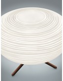 Table lamp with diffused light. A collection of three diffuser shapes in hand-blown glass made using a glass-blowing procedure without turning the glass in the mould (referred to as "stationary"); the striped effect is achieved using a mould with negative decorations which are repeated across the surface of the glass, which is subsequently ground manually "by belt" and which then undergoes immersion in acid in order to emphasise the plaster-like effect. The diffuser rests on a die cast zinc alloy tripod coated with epoxy powder paint with a rough finish on the metal surface. Available in two versions with G9 or E27 lampholder, the version with the G9 lampholder features a dimmer on the transparent cable for the gradual adjustment of brightness, while the version with the E27 lampholder is fitted with an on/off switch.