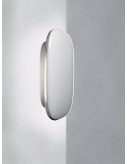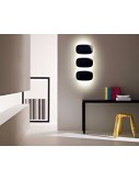 Wall or ceiling lamp with reflected light made of injection moulded polycarbonate. When completely closed, it consists of two elements: a front shielding black or white surface and a wall mounting plate, through which the reflected light passes, in satin finish transparent polycarbonate which also acts as a housing for the lighting technology part. In the large version, electronic ballast and possibility of wall mounting vertically.