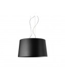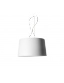 Large suspension lamp with direct and indirect up light. Diffuser made of fibreglass-based composite material and liquid coated. The lamp body consists of a large painted aluminium cone. The diffuser which tops off the cone, where one of the two LED boards is installed, is in PMMA with a prismatic pattern and curved on the edges. The upper LED board is protected by a branded PMMA disc. The LED transformer is housed inside the white painted metal canopy. Triple steel cable for suspending the lamp body and transparent electrical cable; dimmable version available, with the following possible configurations: On-Off /Push/DALI.