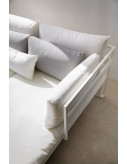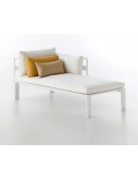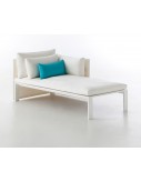 Made of thermo-lacquered aluminium profiles, Solid Surface plate (tables) and polyethylene (chaiselongue). 100% recyclable. Optional polyurethane foam rubber covered with water-repellent fabric. Optional removable fabric cover.