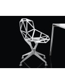 Chair_One is a truly unique seat. The shell is a structure of flat geometric shapes that join up around the edges, like a soccer ball. The shape was the fruit of lengthy preparatory studies, using sketches, cardboard models and prototypes before moving on to production in die-cast aluminium. The chair comes in a choice of finishes: it may be polished for truly durable brilliance, treated with sputtered, fluorinated titanium, or painted for outdoor use. Year: 2008.