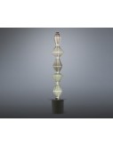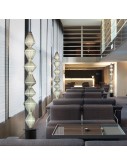 Floor lamp. Steel structure. Black lacquered canopy and black trim disc. Light grey textile diffuser or dark grey fire resistant textile diffuser. Two switches placed in the base. Year: 2016