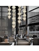 Suspension lamp. Steel structure. White lacquered canopy and chrome trim disc. Light grey textile diffuser or dark grey fire resistant textile diffuser.