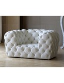Quilted button back model. Structure in fir plywood. Seat frame in fir. Base in wenghé-stained beech. Differentiated density polyurethane foam filling with acrylic fibre covers. Springing with woven elastic straps of covered rubber. Hand-made capitonné work.