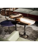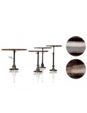 Base made with assembled industrial materials in iron and brass. Wooden top decorated and silk-screened by hand according to the artist’s creativity, and glossy lacquered. Surfaces created by hand as a “picture”; each piece will therefore be different and unique.