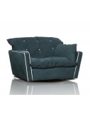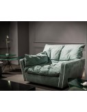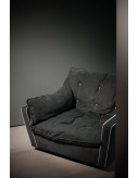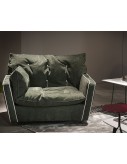 Structure in phenolic plywood and fir essence. Differentiated density polyurethane foam filling with acrylic fibre covering. Revolving base. Seat and armrest cushions in acrylic fibre. The seat cushion made in a unique piece can be laid on right or left armrest. Back cushions in washed and sterilized goose down with polyurethane foam insert in differentiated density. Revolving armchair. Decorative piping in the same shade of leather; upon request, it is possible for the decorative profile to be in the other shades of leathers shown in the catalogue. Possible choice of decoration with same colour or contrast leather and same colour of decoration or red yarn.