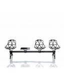 Seating system on bar. Bases in die-cast aluminium painted in polyester powder, suitable for floor-fixing. Bar in anodised aluminium. Seat in die-cast aluminium treated with sputtered fluorinated titanium and painted in polyester powder. Small table in HPL. Cushions in fabric (Kvadrat “Tempo” or “Gloss 2”) or in leather also available. Suitable for outdoor use. Flame-retardant.