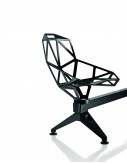 Chair_One is a truly unique seat. The shell is a structure of flat geometric shapes that join up around the edges, like a soccer ball. The shape was the fruit of lengthy preparatory studies, using sketches, cardboard models and prototypes before moving on to production in die-cast aluminium. The chair comes in a choice of finishes: it may be polished for truly durable brilliance, treated with sputtered, fluorinated titanium, or painted for outdoor use. It is available in two versions: a stackable chair with aluminium profile legs, which may be polished, anodised or painted, to meet any needs for home, contract or outdoor settings; or a fixed or swivel chair with a cement base painted transparent that enhances its pleasingly rough texture, typical of contemporary art and architecture. Year: 2006.