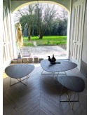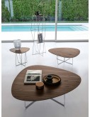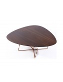 Really original coffee tables and a coat rack that combine Japanese minimalist with Italian handicraft expertise. The metal, gloss gold lacquered, round tubular structure gives the product a different, versatile, architectural appearance depending on your point of view. The tabletops are harmoniously irregular and finished with natural or heat-treated chestnut veneer.