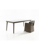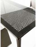 Collection made ​​of high resistance aluminum tube and hand-woven flat synthetic fiber made of high density polyethylene (HDPE), 6-8,5 mm/ 0.24-0.33" wide. The dining tables include a glass top 8 mm/ 0.31" thick. Possibility of creating a wide variety of layouts due to the modularity of its elements.