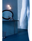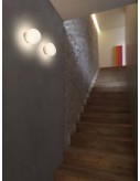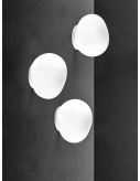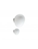 Wall or ceiling lamp with diffused light. White satin finish hand-blown diffuser achieved using glass blowing procedure without turning the glass in the mould (referred to as "stationary"), subject to immersion in acid. The glass in the medium version is incorporated with a matt transparent injection moulded polycarbonate ring nut, which is in white polycarbonate in the small version. Wall fitting in epoxy powder coated metal and matt injection moulded transparent polycarbonate lamp holder support.