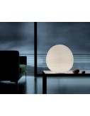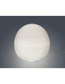 Table lamp with diffused light. Handblown glass made using a glass-blowing procedure without turning the glass in the mould (referred to as "stationary"); the striped effect is achieved using a mould with negative decorations which are repeated across the surface of the glass, which is subsequently ground manually "by belt" and which then undergoes immersion in acid in order to emphasise the plaster-like effect. White epoxy powder coated metal supporting base and matt injection moulded transparent polycarbonate lamp holder support. The dimmer for the gradual brightness adjustment is fitted on the transparent cable for large and black medium version. On/Off version on request.