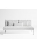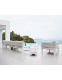 Made of thermo-lacquered aluminium profiles, Solid Surface plate (tables) and polyethylene (chaiselongue). 100% recyclable. Optional polyurethane foam rubber covered with water-repellent fabric. Optional removable fabric cover.