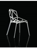 Chair_One is a truly unique seat. The shell is a structure of flat geometric shapes that join up around the edges, like a soccer ball. The shape was the fruit of lengthy preparatory studies, using sketches, cardboard models and prototypes before moving on to production in die-cast aluminium. The chair comes in a choice of finishes: it may be polished for truly durable brilliance, treated with sputtered, fluorinated titanium, or painted for outdoor use. It is available in two versions: a stackable chair with aluminium profile legs, which may be polished, anodised or painted, to meet any needs for home, contract or outdoor settings; or a fixed or swivel chair with a cement base painted transparent that enhances its pleasingly rough texture, typical of contemporary art and architecture. Year: 2003.