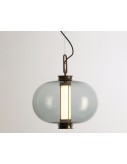 Suspension lamp. Structure and canopy in bronze electroplated steel. Diffuser in blown transparent, amber and grey glass. Strip LED column and module LED placed at the bottom of the luminaire*. Year: 2014.