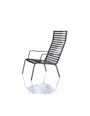Stacking low chair with arms and high back. Stacking foot-stool. Frame in steel tube, cataphoretically-treated and painted in polyester powder. Seat, back and foot-stool made of polyamide slats. Standard injection-moulded. Suitable for outdoor use.